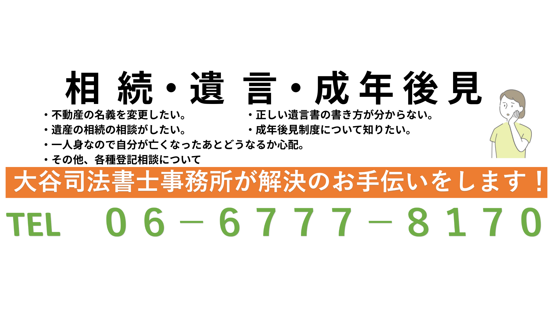 司法書士の大谷篤史(おおたにあつし)と申します。事務所は、大阪市生野区桃谷にあり、桃谷商店街を抜け、疎開道路を北に進み、青果市場の向かいのマンションにあります。相続登記、成年後見、不動産登記、会社の登記、債務整理、帰化など幅広い業務を承っております。身近な街の法律家として、様々なお悩みの窓口となり、問題を解決するためのサポートをさせていただきます。私は、特別養護老人ホーム介護職員、地域包括支援センター職員など福祉業界に長く関わってきました。その経験を活かし、ご依頼者様の相談に親身になって対応させていただきます。お気軽にご相談ください。
